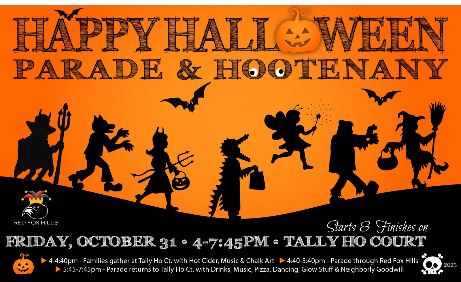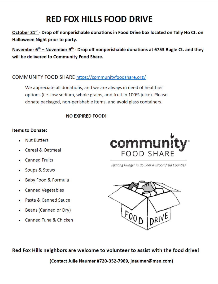 October 31st - Drop off nonperishable donaτons in Food Drive box located on Tally Ho Ct. on Halloween Night prior to party.